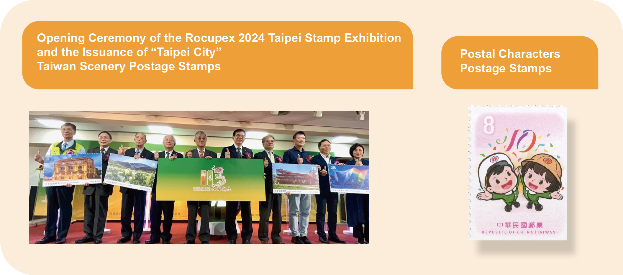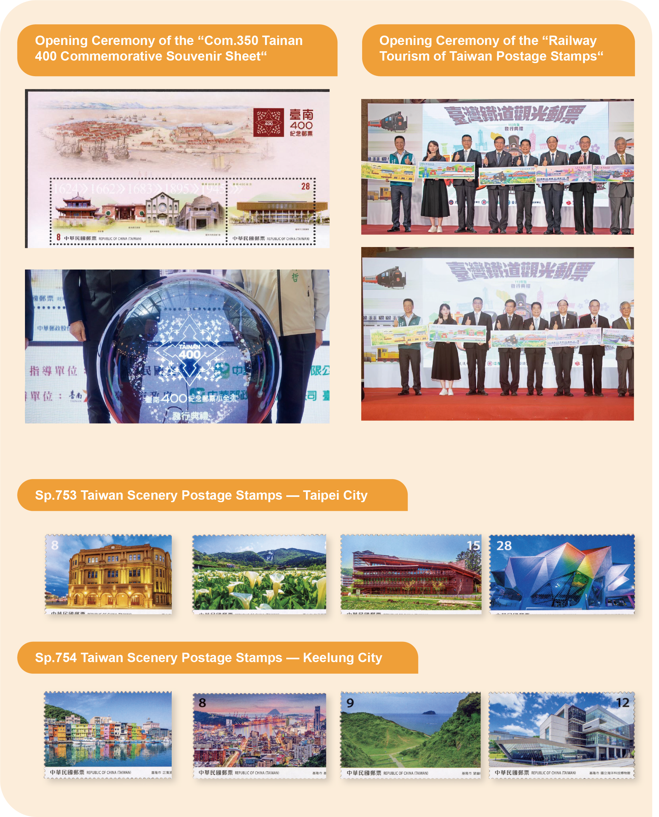 As time passes, Chunghwa Post continues to refine the stamp design, printing, and distribution strategies accordingly. We have shifted to gift giving, refinement, and customization, and developed innovative printing technologies. Themes popular among young people are strengthened, such as the combination of internationally renowned cartoon characters with peripheral products, a series of gold and silver ingots, and other products, to actively develop various philatelic products that meet market demands and drive a boom in purchasing and collecting. In 2024, the Issuing Ceremonies of the Miniature Sheet of Stamps- Tainan 400 Commemorative Souvenir Sheet and Railway Tourism of Taiwan Postage Stamps (Issue of 2024) were held. The opening ceremony of 2024 National Stamp Exhibition & the Issuing Ceremony of Taiwan Scenery Postage Stamps — Taipei City was held from October 9th to 12th. This 28th National Stamp Exhibition aimed at upholding its mission to foster interest in philately while delivering a premium cultural experience to the public. The exhibition displayed 262 frames of stamp collections from all over Taiwan, including 211 frames in the competition category, 40 frames in the invited section, and 11 frames showcasing the best philatelic works from Philately Classroom.