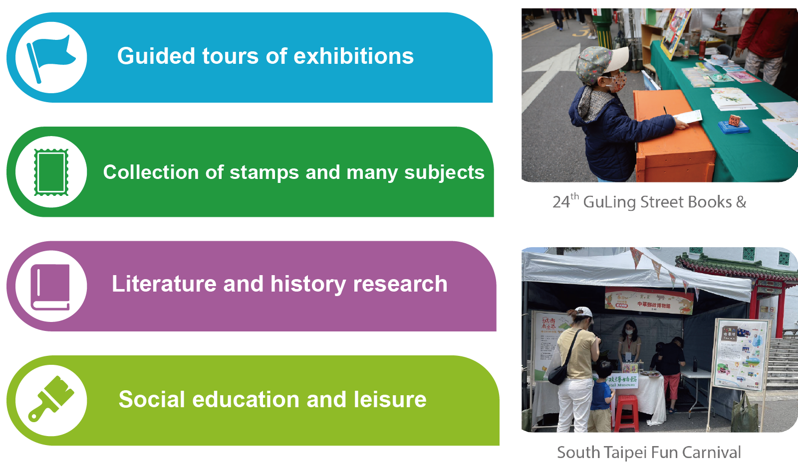 Postal Museum was established on December 1, 1965, serving as a professional postal museum with collection, research, exhibition, and education functions. It has long been committed to preserving postal culture and historical materials, promoting the cultural heritage and mission of the postal service. It fosters internal learning and a spirit of service among staff while also serving as a platform for philatelic knowledge exchange, fulfilling both social educational and recreational functions. In recent years, based on the purpose of revitalizing the value of assets, sharing collection resources and promoting cultural tourism, Chunghwa Post has used the unused or surplus space in the buildings under the Taipei, Taichung and Kaohsiung post offices to establish postal art and cultural exhibition spaces in northern, central and southern Taiwan. Postal Museum is a good neighbor for all. Through the participation in community activities, we integrate with local culture, implement Chunghwa Post’s philosophy of caring for the community and giving back to society, deepen the engagement with local communities, strengthening the image of postal service, and enhance the public welfare image of postal service.