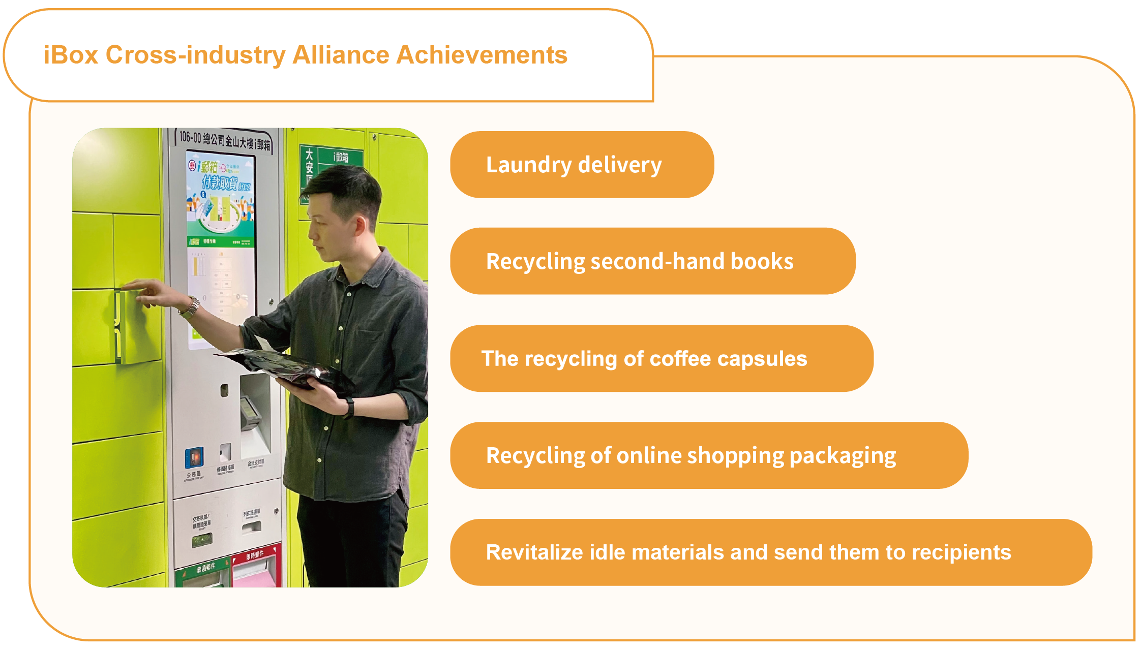 iBox is mainly installed in post offices, MRT stations, community buildings, and other places where people gather,which can effectively extend post office service hours and locations. Combined with the IoT technology and the extensive mail delivery network of post offices, iBox provides customers with 24/7 self-service mail pickup/outgoing mail services. In addition, third-party payment processors for iBox postage payment include Postal VISA Debit Cards, Stored Value Card (EasyCard, iPass and icash) and iPASS MONEY, Easy Wallet, JKOPAY, icash Pay, All Win Fintech +PAY, and PX Pay. To develop smart logistics and improve accessibility, iBox actively expands cross-industry alliance. By adopting a“multi-parcel, single-drop” delivery approach, energy consumption and carbon emissions associated with the vehicle trips can be significantly reduced, creating positive benefits for the environment and society.