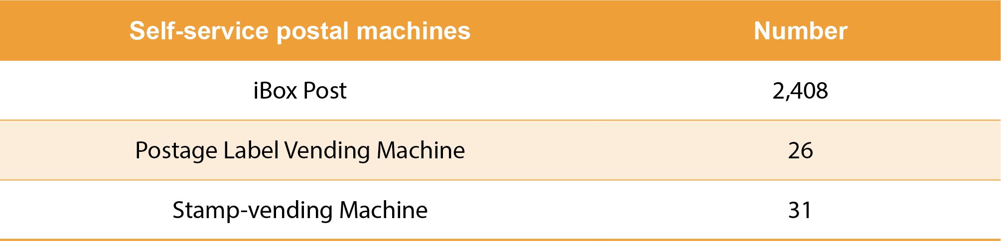 Chunghwa Post shoulders the legal duty of providing Universal Postal Service for the collection and delivery of domestic and international mails. We have established operating sites throughout Taiwan, and the goal is to maintain a coverage rate of more than 99%. As of the end of 2024, there are 1,296 post offices (including 1,295 post offices and 1 Taipei Mail Processing Center) and 678 contracted agencies (including 422 agencies and 256 stamp sales agencies), offering standardized and affordable rates and nationwide services to ensure every citizen’s right to basic communication. To meet the postal needs of the public, Chunghwa Post currently still maintains the basic requirement of at least 1 mailbox per village, and various self-service postal machines have been gradually installed in recent years to ensure immediate, reliable, and efficient postal services.