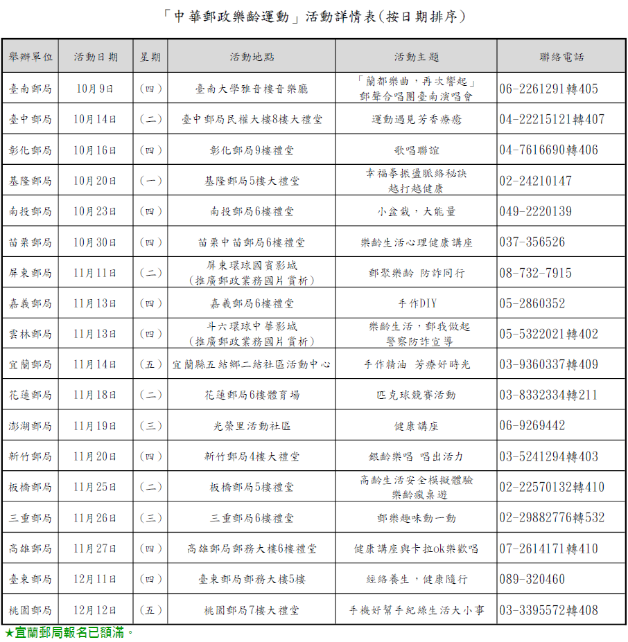 中華郵政公司為鼓勵銀髮族保戶及多元屬性人員參與社會活動,拓展人際關係,提升自我健康管理觀念,打造「樂活健康」的生活,自114年10月1日至12月31日於基隆、臺北、板橋、三重、桃園、新竹、苗栗、臺中、彰化、南投、雲林、嘉義、臺南、高雄、屏東、宜蘭、花蓮、臺東、澎湖等全臺19個郵局分別舉辦「中華郵政樂齡運動」活動。