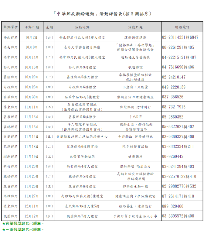 中華郵政公司為鼓勵銀髮族保戶及多元屬性人員參與社會活動,拓展人際關係,提升自我健康管理觀念,打造「樂活健康」的生活,自114年10月1日至12月31日於基隆、臺北、板橋、三重、桃園、新竹、苗栗、臺中、彰化、南投、雲林、嘉義、臺南、高雄、屏東、宜蘭、花蓮、臺東、澎湖等全臺19個郵局分別舉辦「中華郵政樂齡運動」活動。