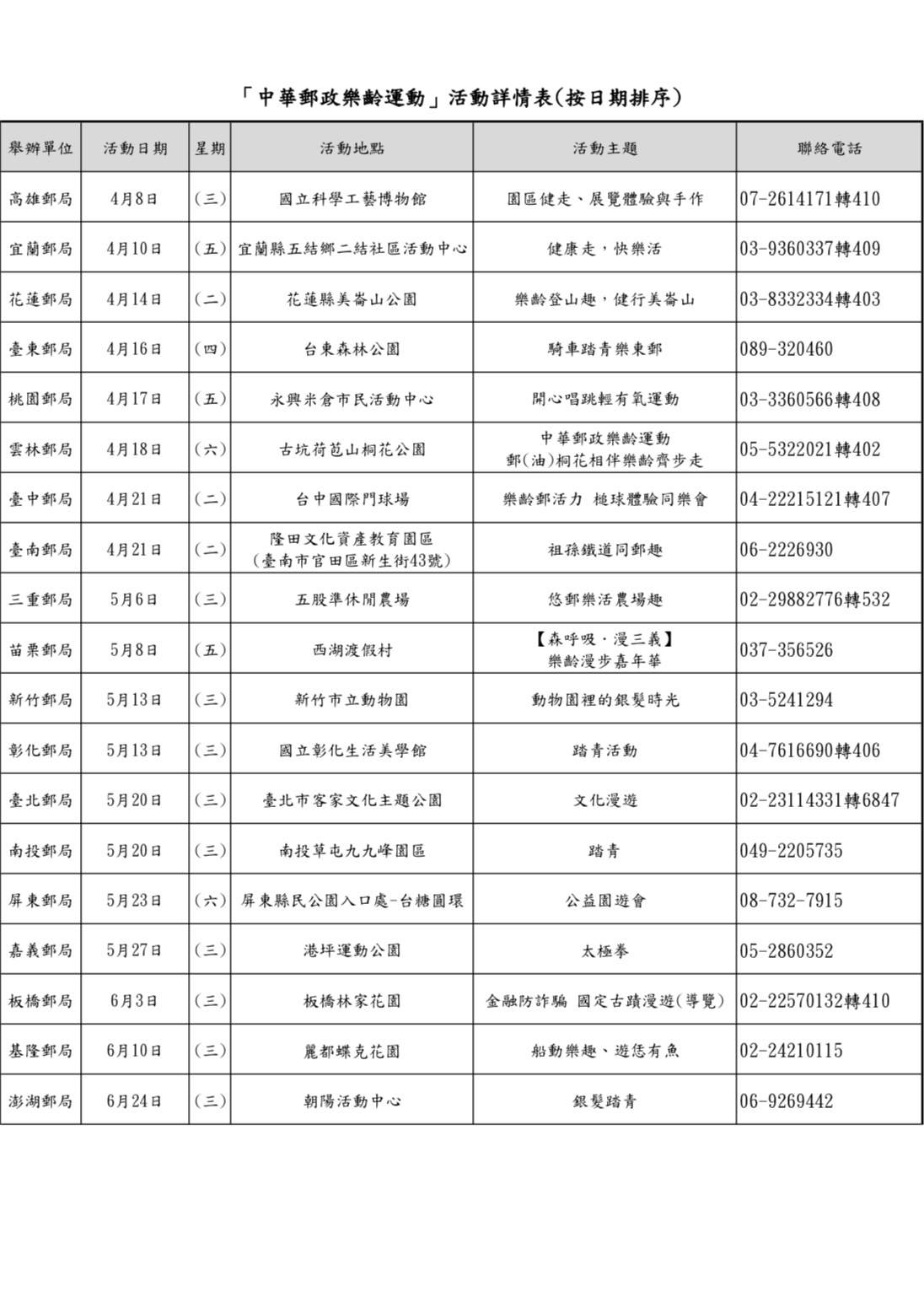 中華郵政公司為鼓勵銀髮族保戶及多元屬性人員參與社會活動,拓展人際關係,提升自我健康管理觀念,以打造「樂活健康」的生活,自115年4月1日至6月30日於基隆、臺北、板橋、三重、桃園、新竹、苗栗、臺中、彰化、南投、雲林、嘉義、臺南、高雄、屏東、宜蘭、花蓮、臺東、澎湖等全臺19個郵局分別舉辦「中華郵政樂齡運動」活動。