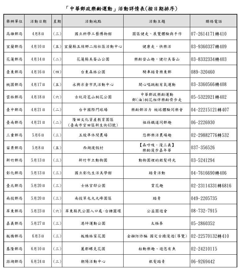 中華郵政公司為鼓勵銀髮族保戶及多元屬性人員參與社會活動,拓展人際關係,提升自我健康管理觀念,以打造「樂活健康」的生活,自115年4月1日至6月30日於基隆、臺北、板橋、三重、桃園、新竹、苗栗、臺中、彰化、南投、雲林、嘉義、臺南、高雄、屏東、宜蘭、花蓮、臺東、澎湖等全臺19個郵局分別舉辦「中華郵政樂齡運動」活動。
