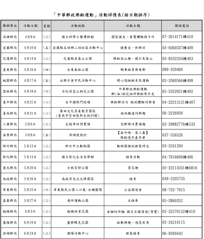 中華郵政公司為鼓勵銀髮族保戶及多元屬性人員參與社會活動,拓展人際關係,提升自我健康管理觀念,以打造「樂活健康」的生活,自115年4月1日至6月30日於基隆、臺北、板橋、三重、桃園、新竹、苗栗、臺中、彰化、南投、雲林、嘉義、臺南、高雄、屏東、宜蘭、花蓮、臺東、澎湖等全臺19個郵局分別舉辦「中華郵政樂齡運動」活動。